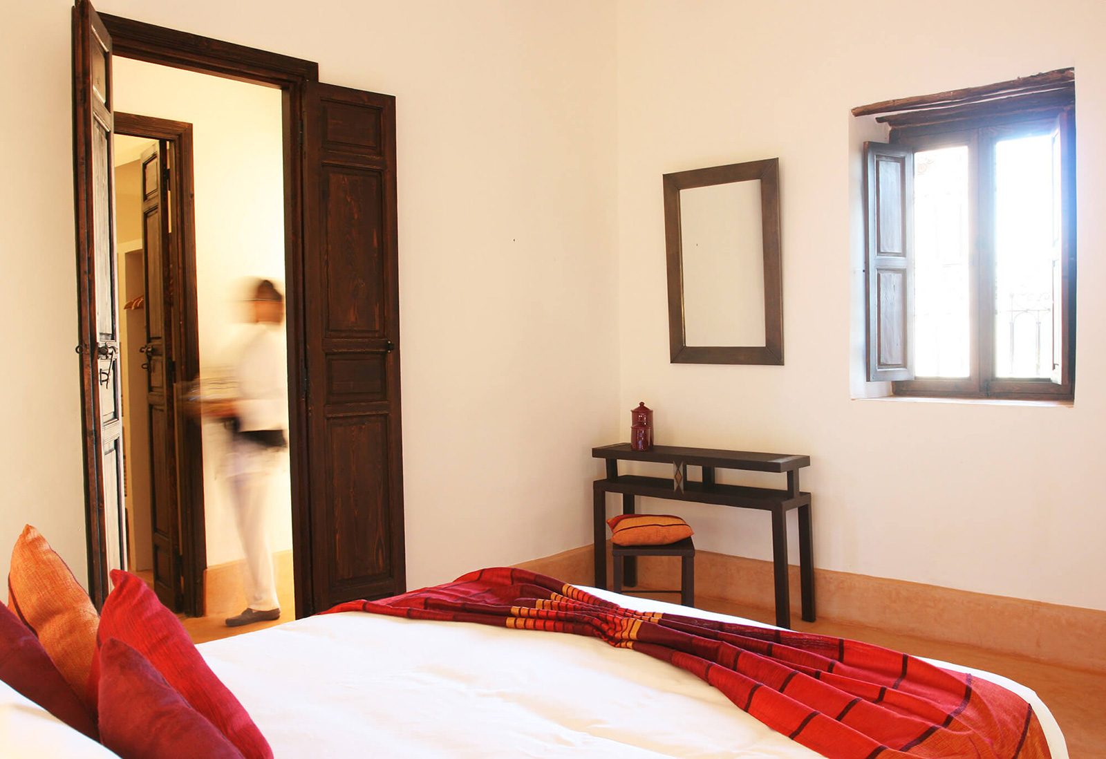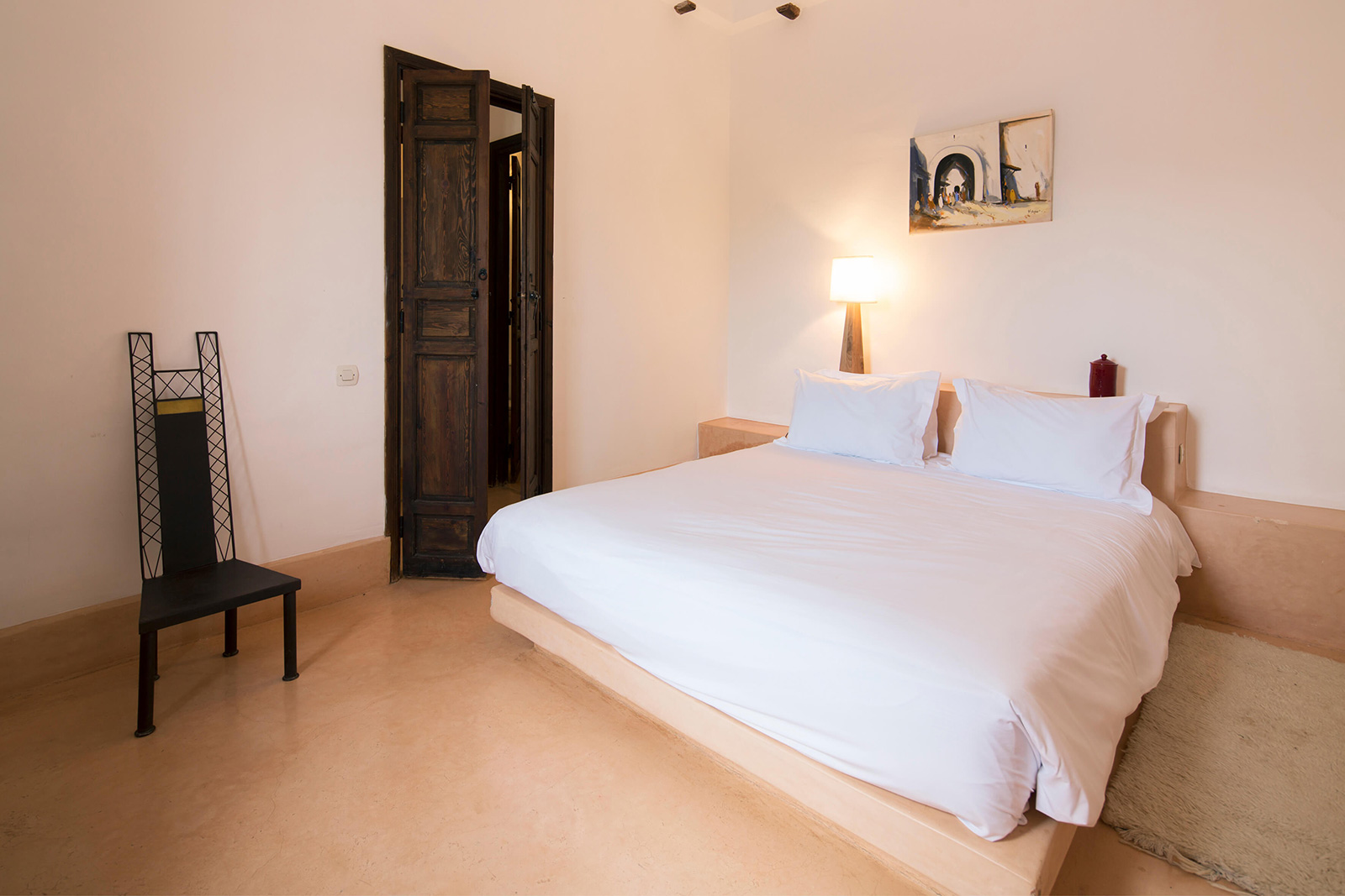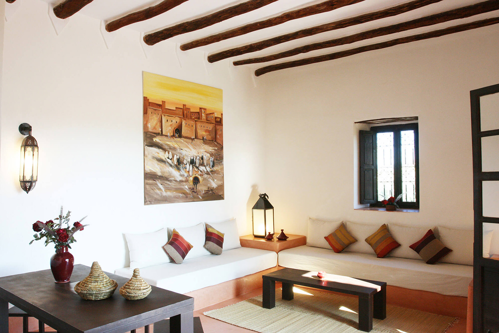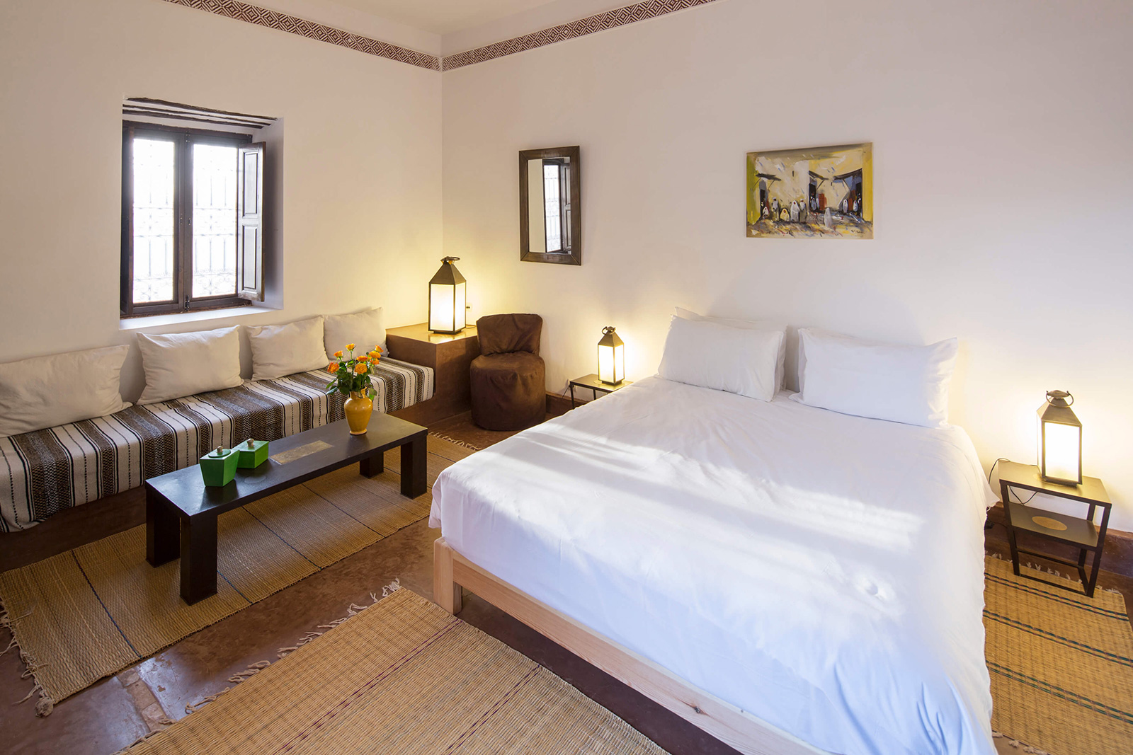 13 chambres doubles “Baraka” (env. 30 m2) s’ouvant sur un patio avec une vue sur les jardins ou sur les montagnes du Haut-Atlas, avec un lit double ou 2 lits séparés, coin-salon avec banquette, TV, coffre-fort, climatisation, petit dressing, salle de bains avec douche, WC séparés, radiateur et produits d’accueil naturels.