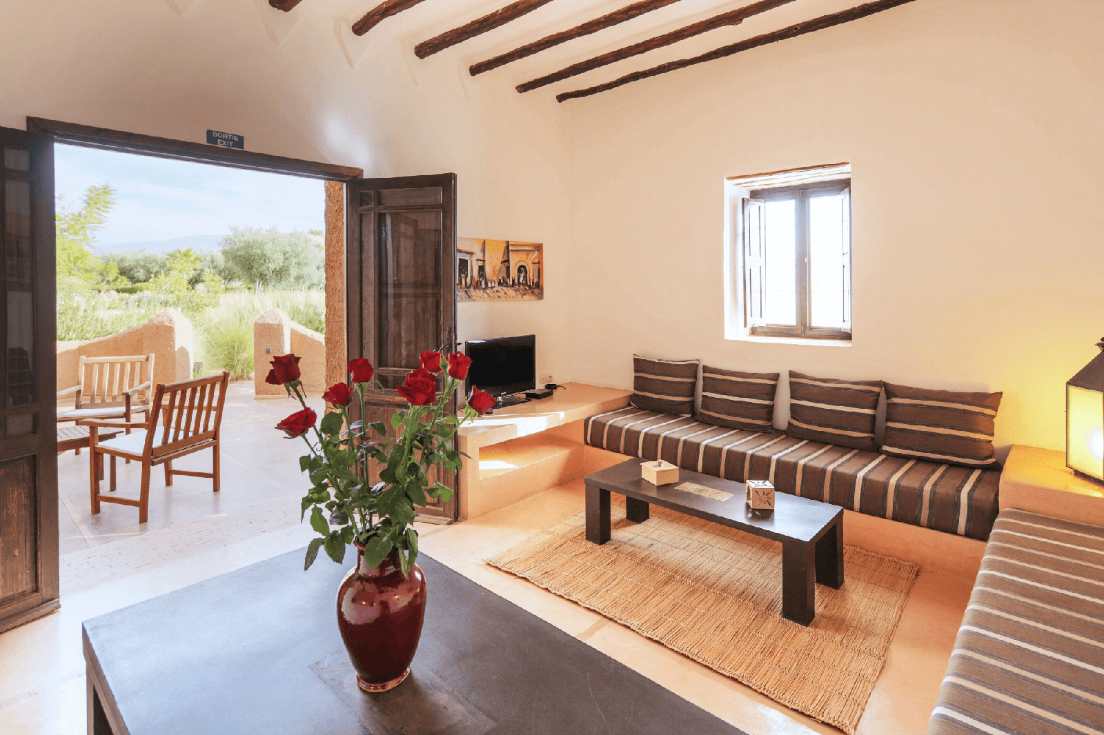 Suites (env. 45 m2), s’ouvrant sru un patio et sur les jardins, les montagnes du Haut-Atlas, avec une chambre avec un grand lit ou 2 lits séparés, avec un salon à la marocaine, coin salle à manger, TV, climatisation et chauffage, coffre-fort, dressing, salle de bains avec douche, sèche-cheveux et WC séparés.