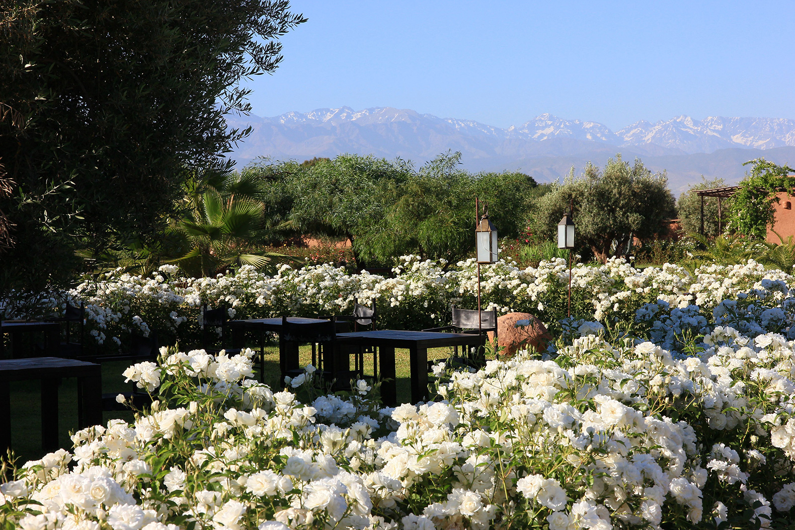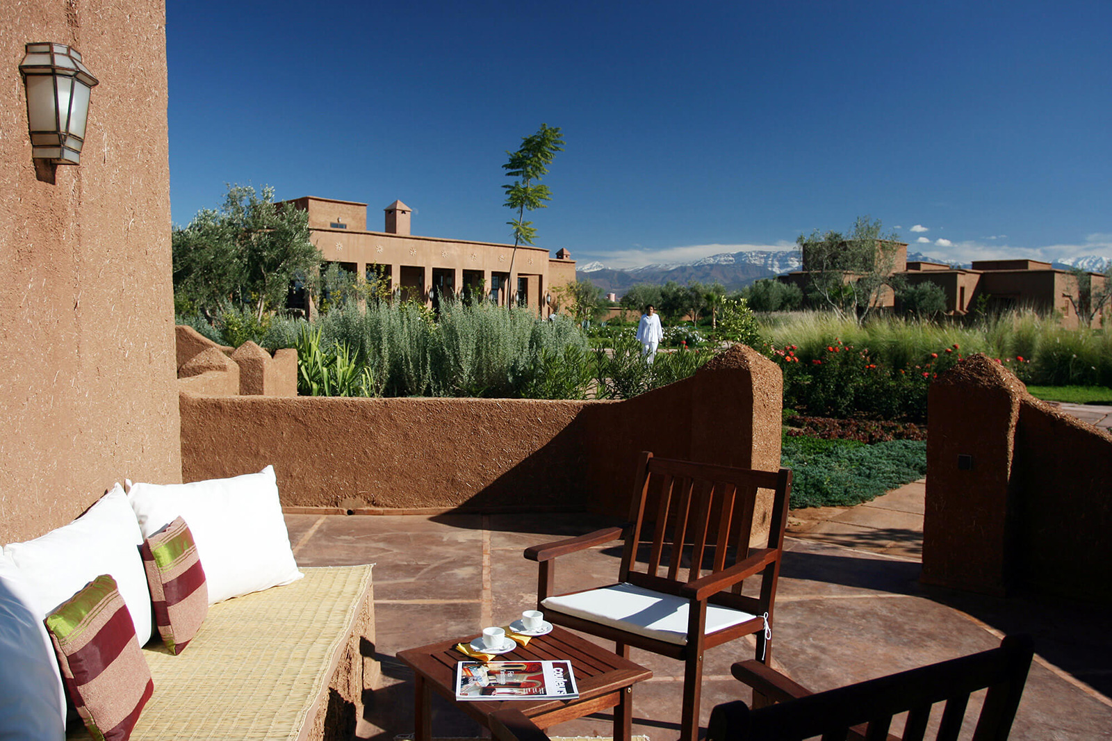 Pavillon Atlas (env. 70 m2, capacité max. 4 adultes, possibilité de lit suppl. dans le salon), composé d’une Suite et d’une chambre “Berbère”, avec salle de bains privée. Chaque Pavillon a son patio et sa terrasse avec une vue imprenable sur les montagnes de l’Atlas et les jardins, salon avec coin marocain et coin salle à manger, climatisation et chauffage, TV, coffre-fort, salle de bains avec douche, sèche-cheveux et produits d’accueil naturels.