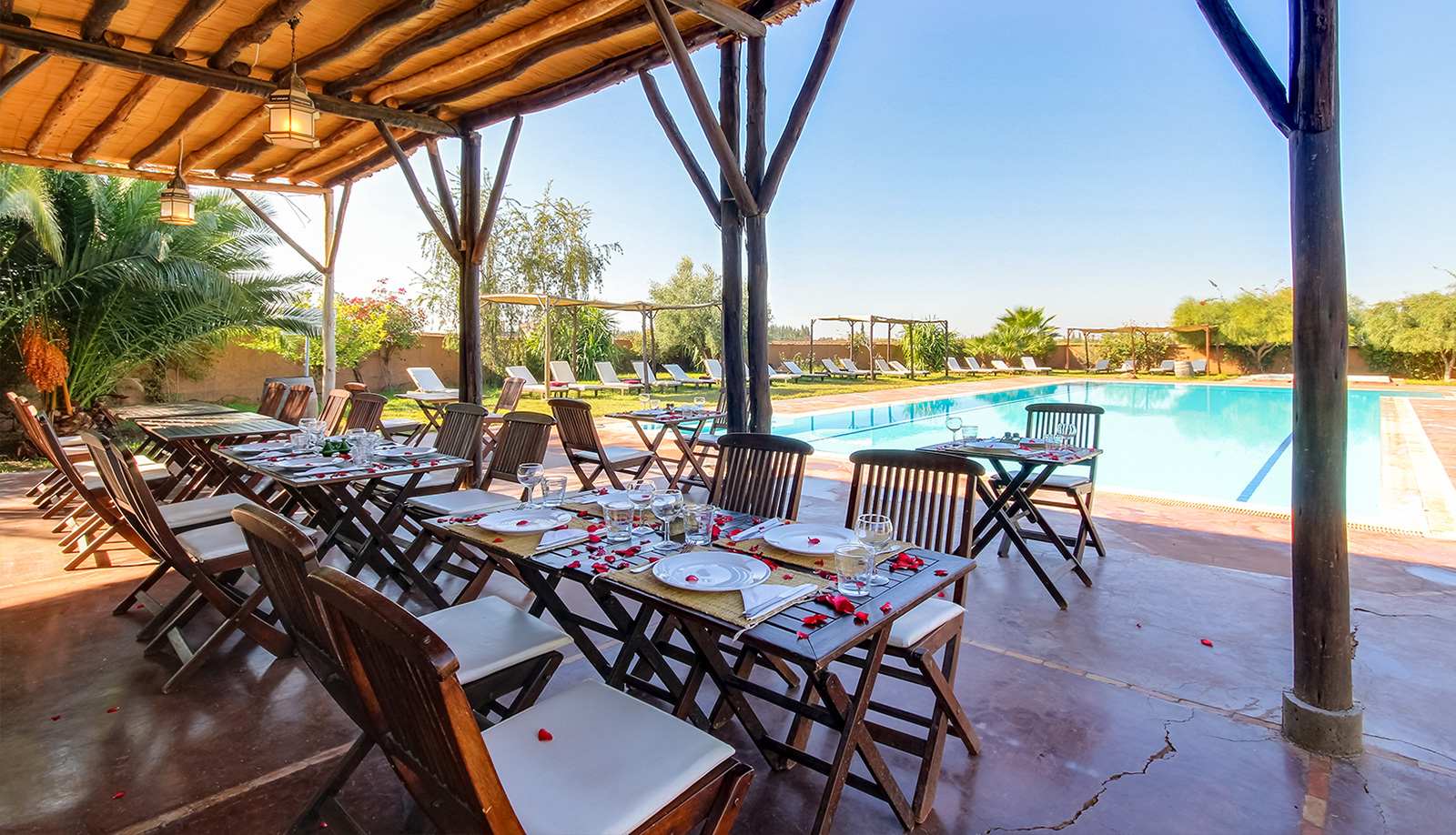 Au restaurant, un petit déjeuner buffet varié et copieux vous est servi, basé sur des produits frais préparés sur place, déclinés en sucrés et salés. Fruits frais ou secs, découpés ou en jus, yaourts bio ou parfumés, crêpes et galettes marocaines, cakes, pains de la maison, œufs fermiers, et laitages… ou sur demande des pâtes, saucisses et autres petites spécialités marocaines. Pour le déjeuner, des salades composées, des sandwichs avec salade et frites, des grillades avec les légumes du jour, des desserts… Pour le dîner, entrées variées, salades, potages en hiver avec les légumes du jardin ou pâtes. Tajines, couscous, poissons du jour, selon le marché. Pour le dessert, salades de fruits frais, crèmes ou les bonnes tartes de Khadija.
