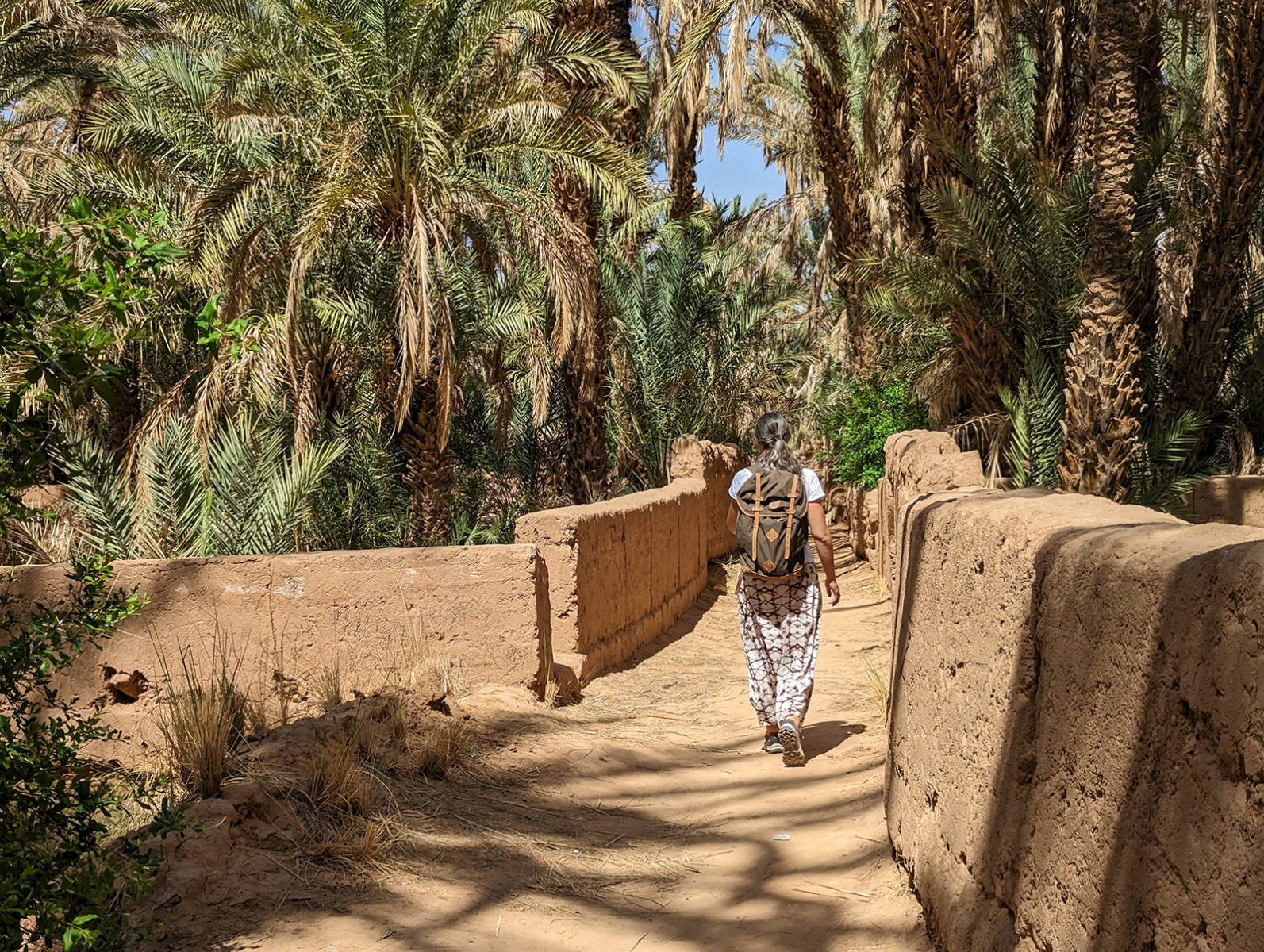 Petit déjeuner. Vous poursuivez votre randonnée vers les villages fortifiés de Tioughassine et Annemiter, dont l’architecture a souvent inspiré le peintre Jacques Majorelle au début du XXeᵉ siècle. Vous rejoignez ensuite le beau village de Tighouza, dominant l’ensemble de la vallée. Dîner et nuit chez l’habitant (logement en maison d’hôtes en option).