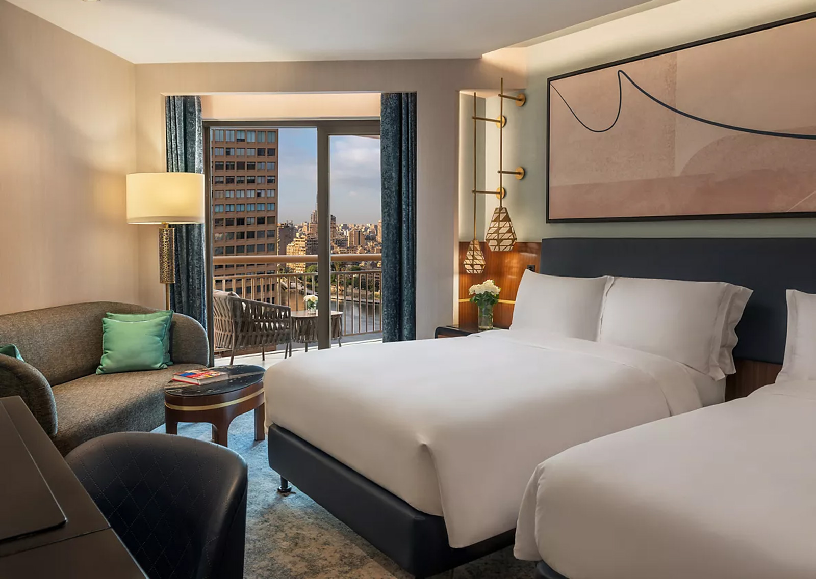 Le Sofitel Cairo Downtown Nile propose 615 chambres et suites élégantes, décorées dans un style contemporain avec des touches locales raffinées. Chaque chambre offre une vue sur le Nil ou sur la ville, et est équipée de lits luxueux, d’une salle de bain moderne, d’un espace de travail et de technologies dernier cri. Les suites offrent des espaces de vie séparés, idéales pour un séjour encore plus exclusif.