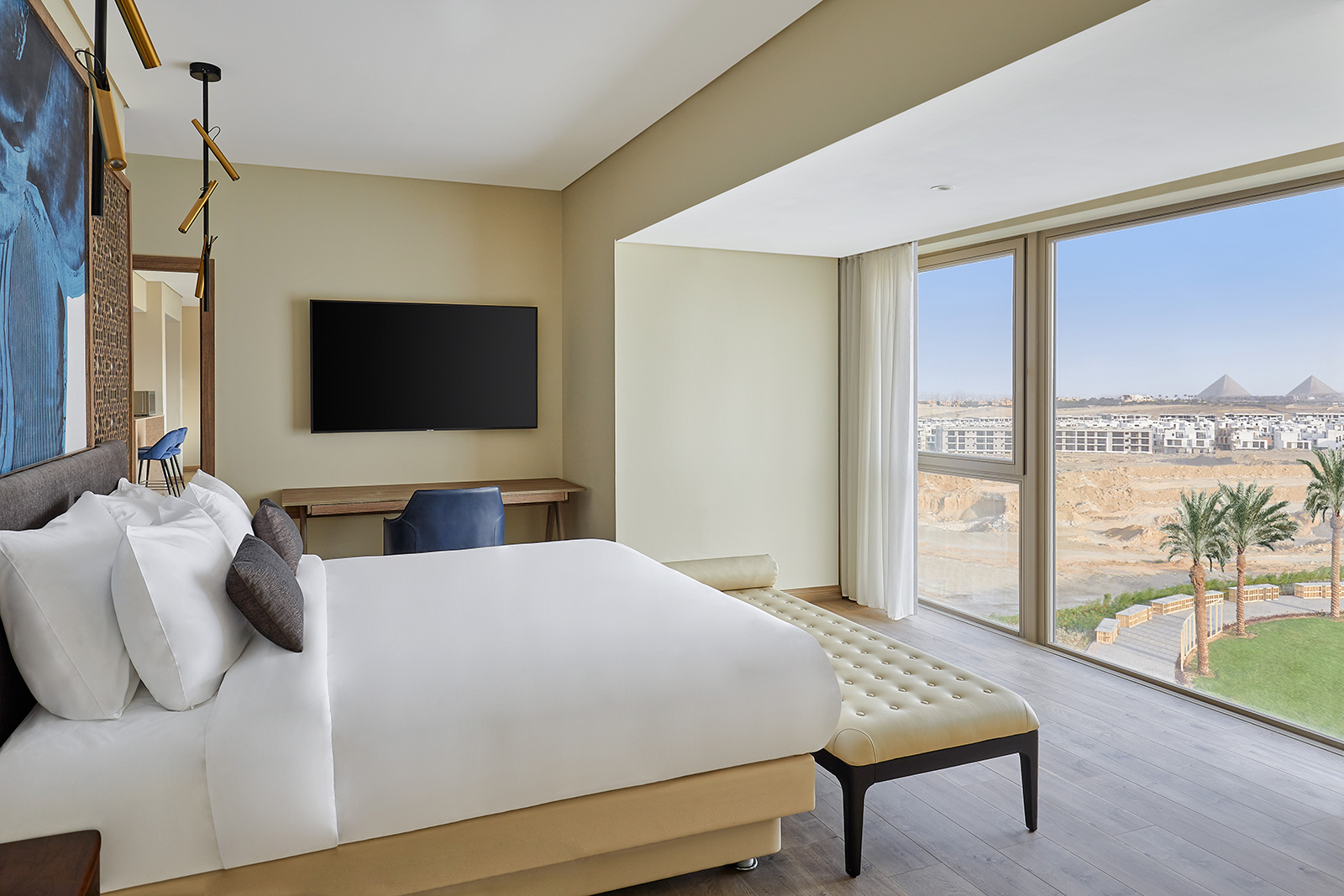 L’hôtel compte 250 chambres et suites, conçues dans un style contemporain, épuré, avec des touches élégantes. Chaque chambre offre un confort exceptionnel avec des lits moelleux, des salles de bain modernes, et des équipements dernier cri. Certaines suites disposent de terrasses privées avec vue sur les pyramides ou les jardins, idéales pour se détendre dans un cadre raffiné.