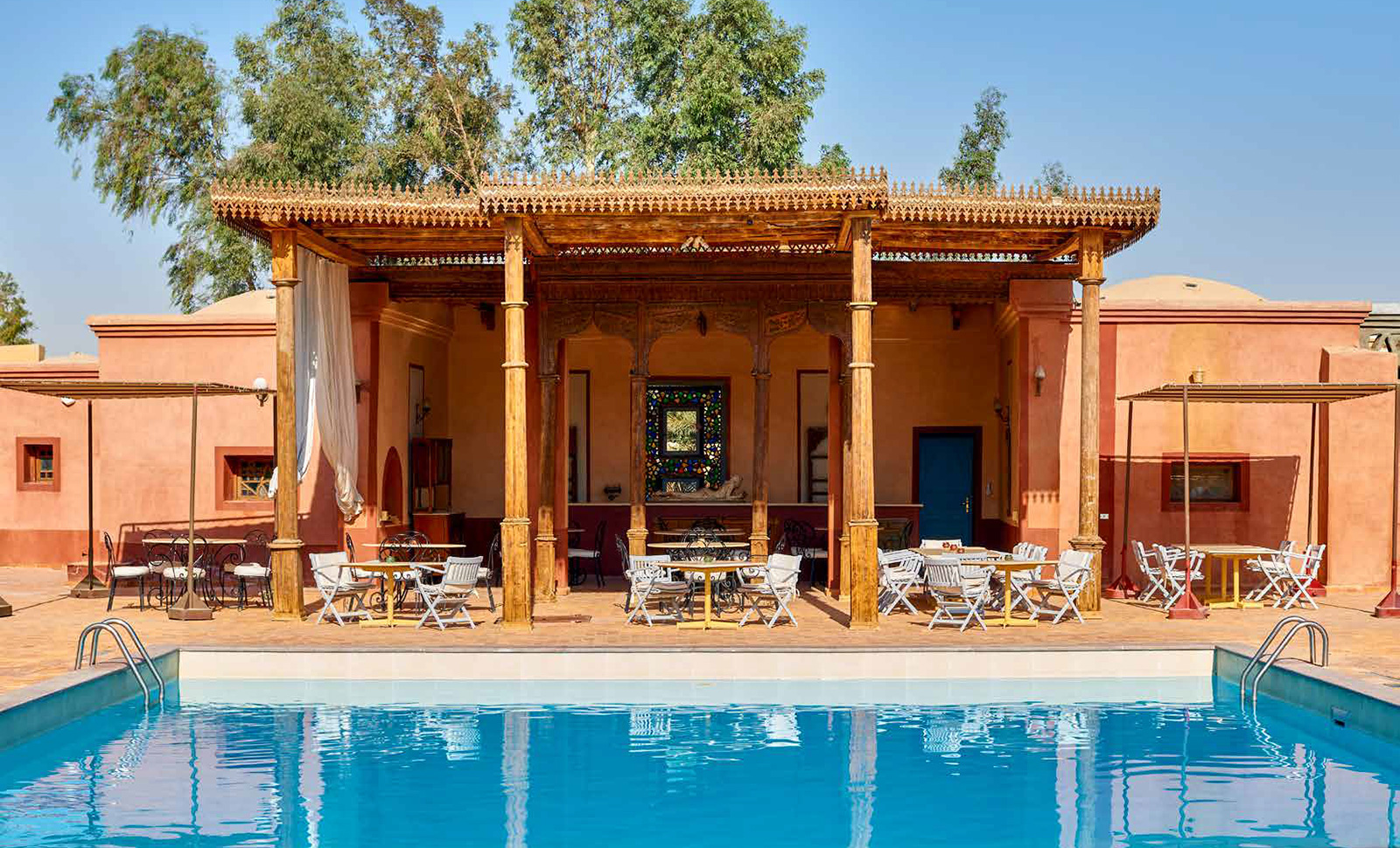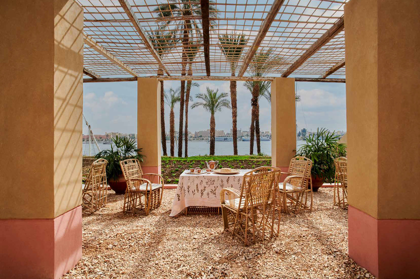 Un lieu unique, surprenant, Al Moudira s’inscrit dans la grande tradition des palais arabes, fait de coupoles et d’arcs, entremêlant colonnes, auvents et arabesques. Loin de l’agitation de Louxor, cet hôtel est le lieu idéal pour le repos et la détente après une journée de visites. Situé sur la rive ouest du Nil, à env. 30 min. en voiture du centre de Louxor par la route et à 20 min. par bateau et taxi. La vallée des Rois et le temple de Hatchepsut ne sont qu’à 4,5 km.